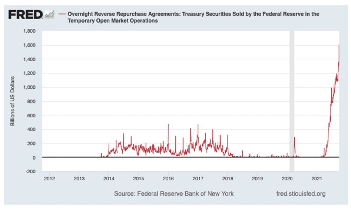 The system is flush with cash. At the end of September, the Fed’s overnight reverse repo facility had $1.6 trillion, which is a direct result of Fed open market operations. As Jerome Powell said on 60 Minutes last year: “We print it digitally…When the Fed balance sheet grows, money supply grows.”
