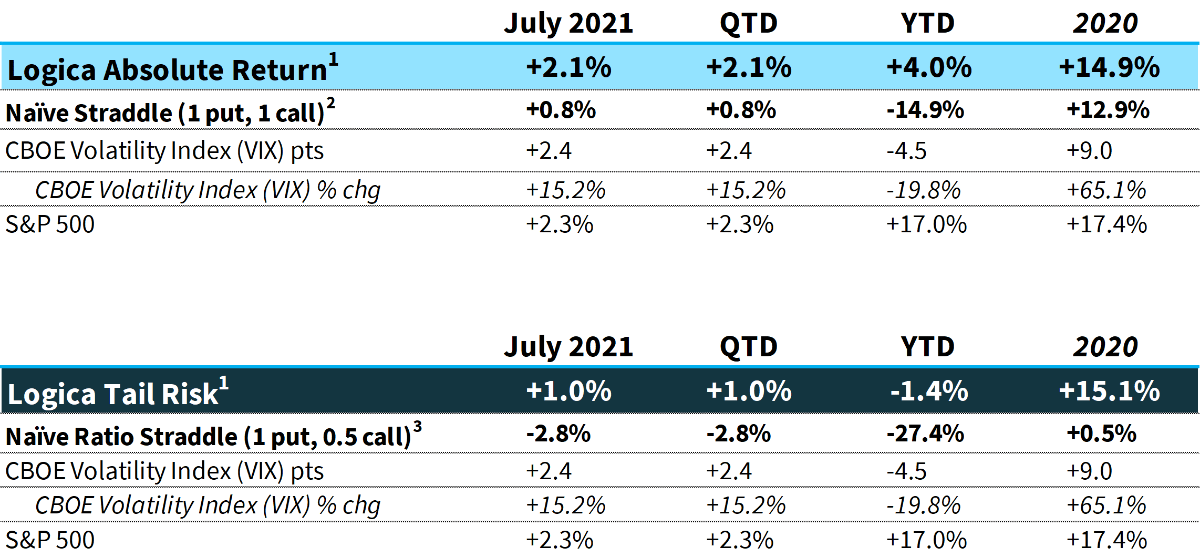 Summary: Equity markets continue to charge ahead with seemingly little resistance, although factor rotations continue to play out under the hood with the S&P 500 and Nasdaq 100 both up more than 2% while the Russell 2000 was down more than 3.5% in July. VIX/Implied Volatility provided a bit of a tailwind for a change, ringing its first positive month since January 2021.