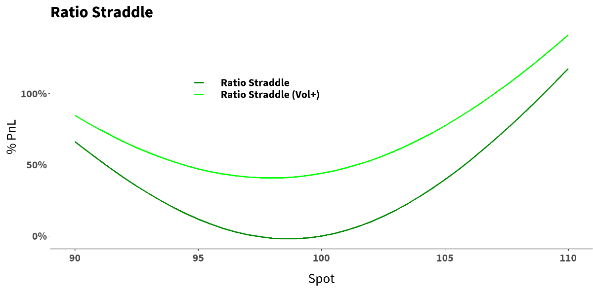 Now, for illustration purposes, we show a long delta tilted straddle: long 1.3 Calls for every 1 Put. Hence, no longer delta neutral. We see that with a modest volatility tailwind of +8.5 points – as would surely be expected during a crisis (recall that during February 2020, VIX increased 24.6 points, and then another 45 points to the peak in March 2020)– even a long-delta tilted straddle is in very good shape given a significant down move in the underlying.