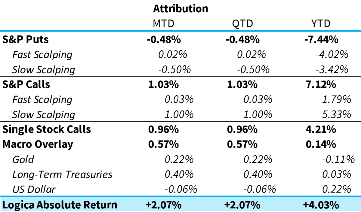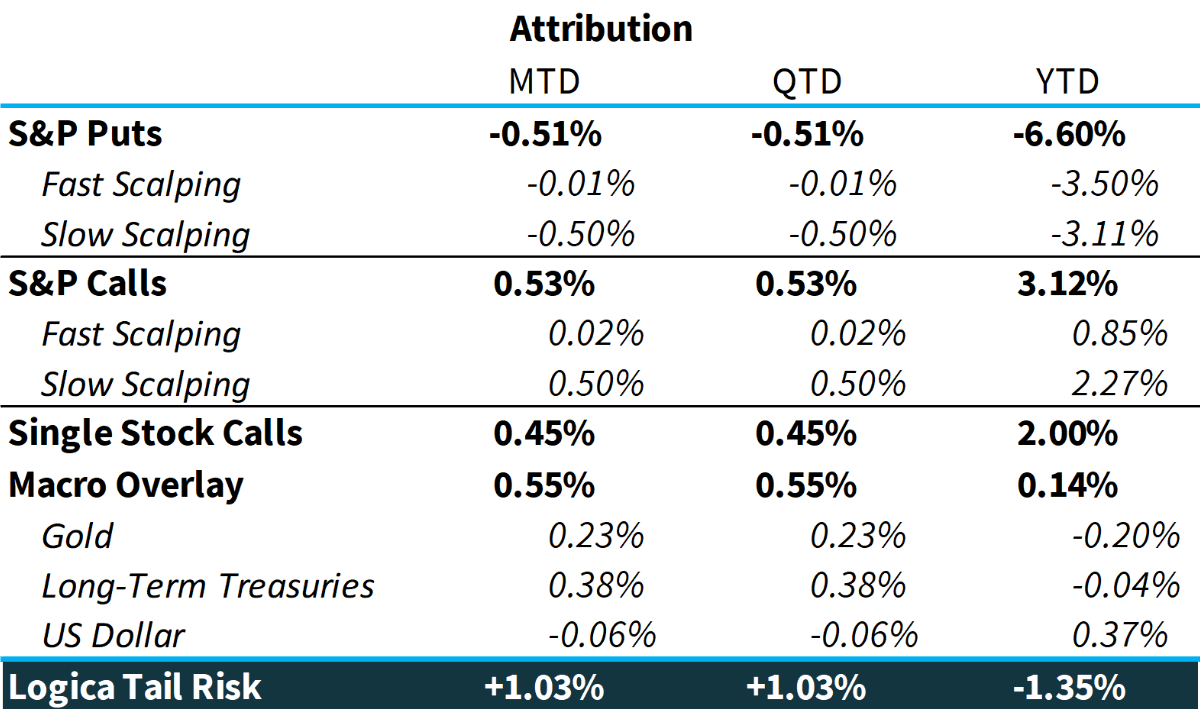 Digging deeper, our daily distribution of returns was as expected, with one interesting difference: we were able to slightly outperform our historical distribution at the extremes, namely, on the best and worst S&P 500 days over the month. Recall that our fast scalping S&P Puts module helped to monetize profits, while our Calls naturally participated in the market’s climb. The big point being that both our strategies were positive on both “extreme” days: