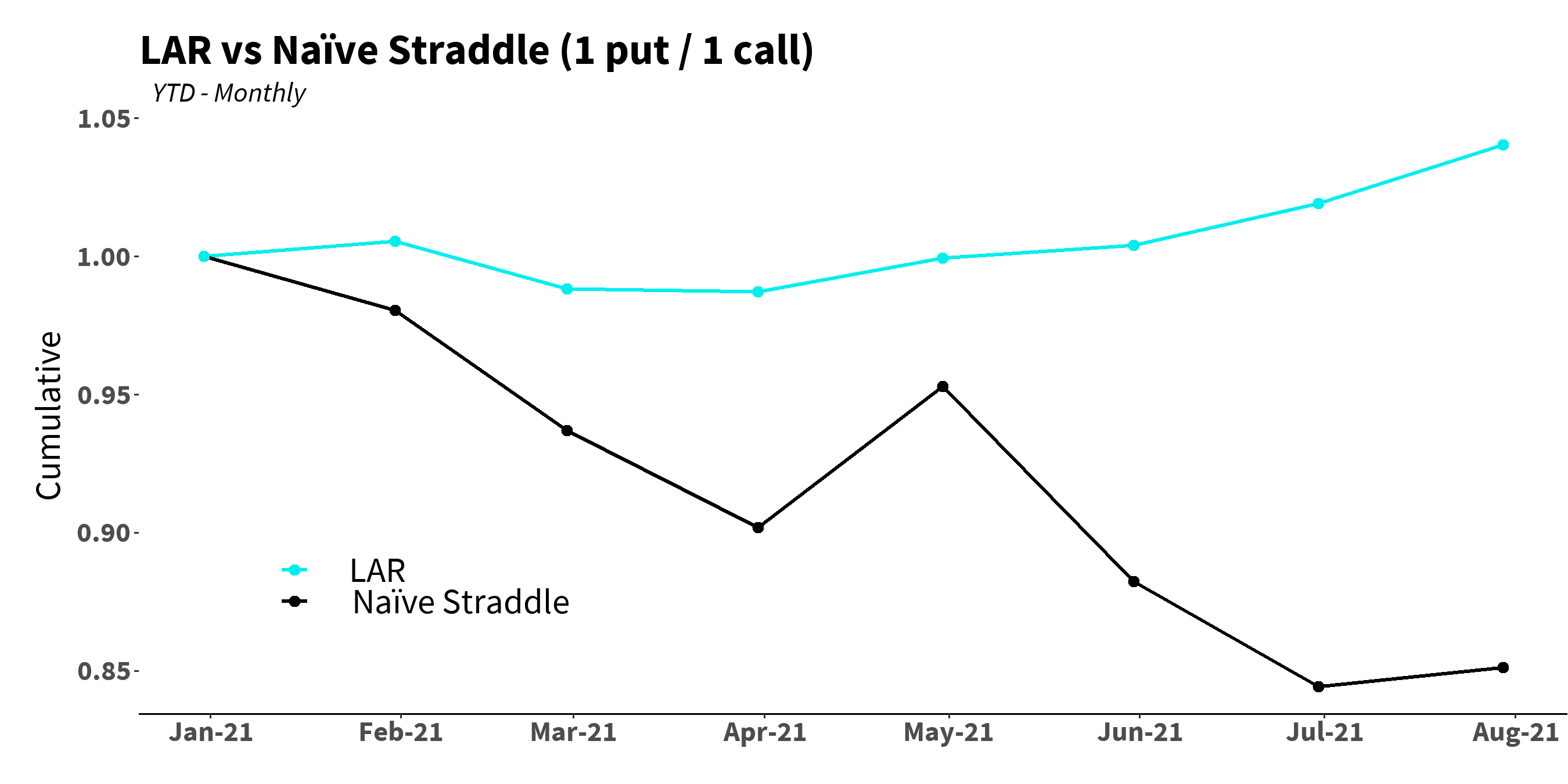 Both strategies nicely outpaced a naïve straddle in July. We continually see how a naïvely implemented (think “buy and hold”) strategy consistently fails to hold on to gains when volatility spikes: